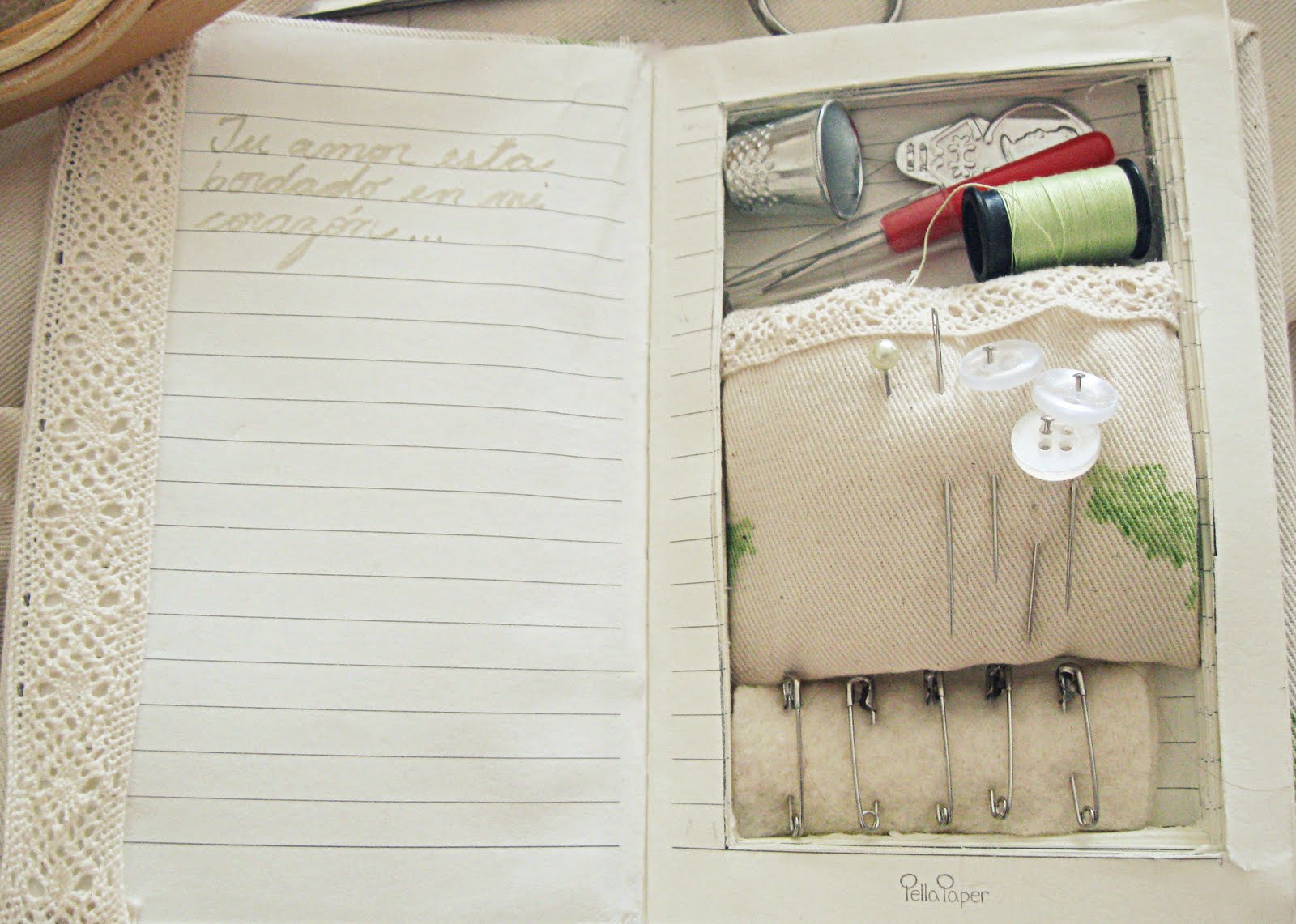 I made my mom a little sewing kit carved out of an inexpensive notebook.