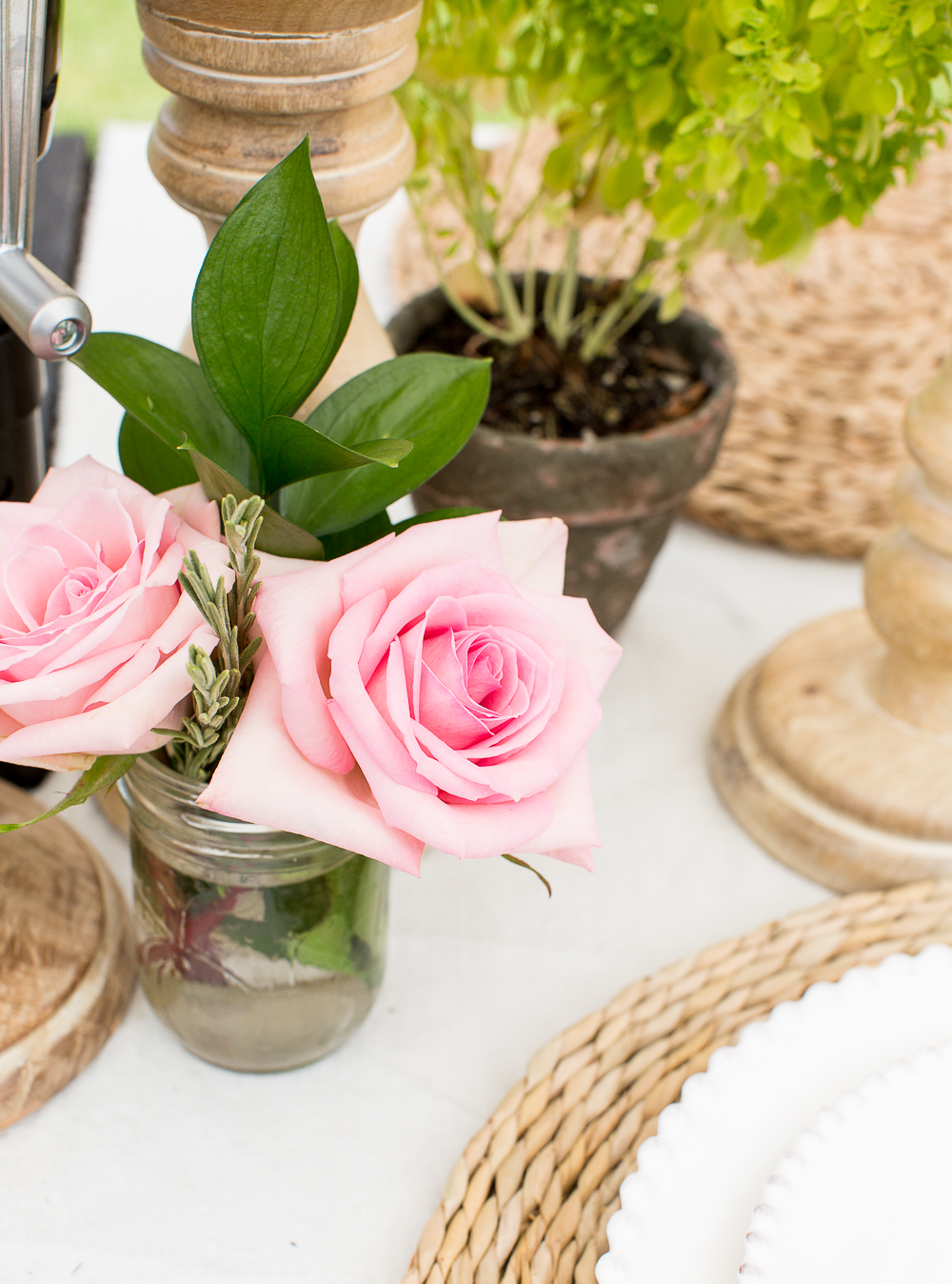 Your table setting is lovely. For me though looking at a pot with dirt at a table looks dressier with moss placed over the dirt. Love the pink roses in the mason jars 🙂 Thank you for your pictures. Would enjoy a tour of your garden!..