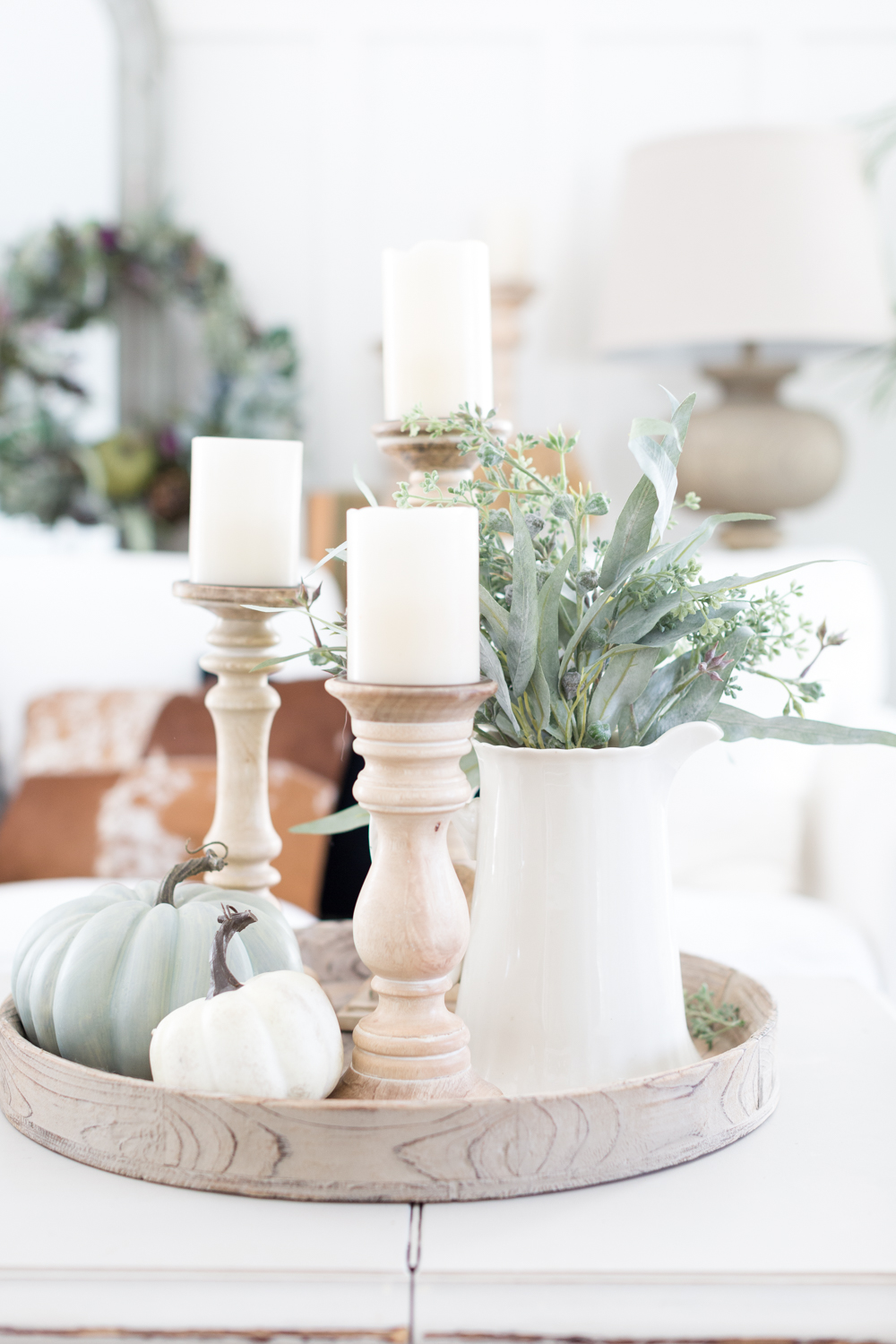When decorating for a particular season, I like to first pick my color theme. This year, I wanted to use more muted tones, but include subtle hints of rust and dark blues. I also knew I wanted to change my couch table a little and try something different. Keeping that in mind….