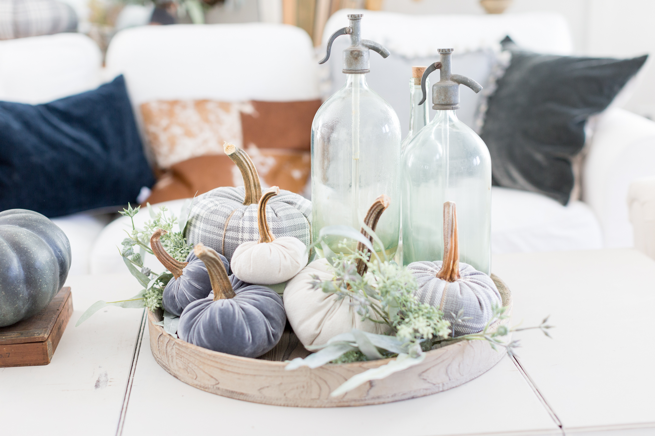 Oh my goodness! Your fall decor is just perfect. I love the color palette, the faux pumpkins and those seltzer bottles! Nicely done!