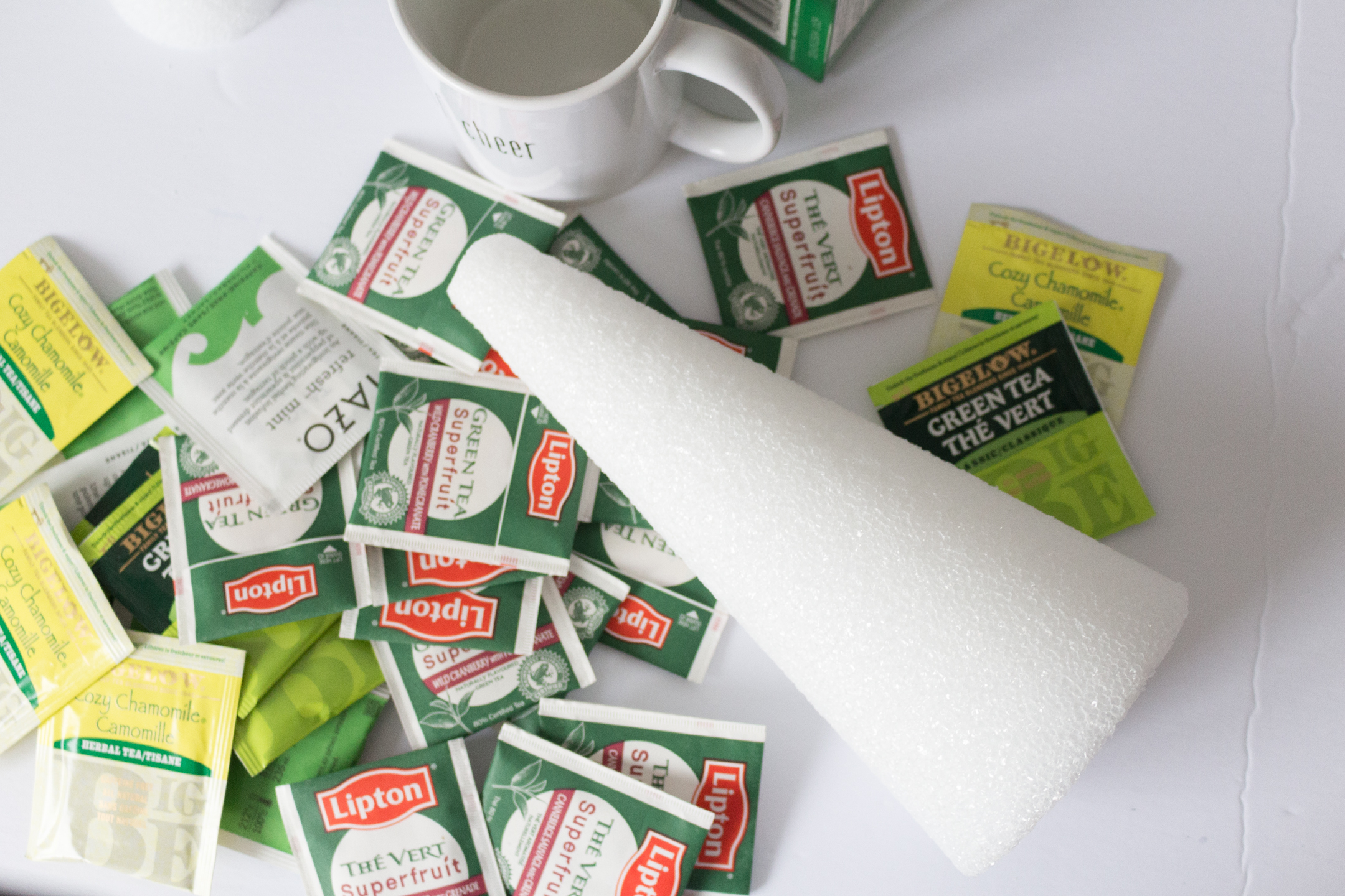 All you need are some assorted teas, a foam cone from FloraCraft, a hot glue gun and a cute little mug.