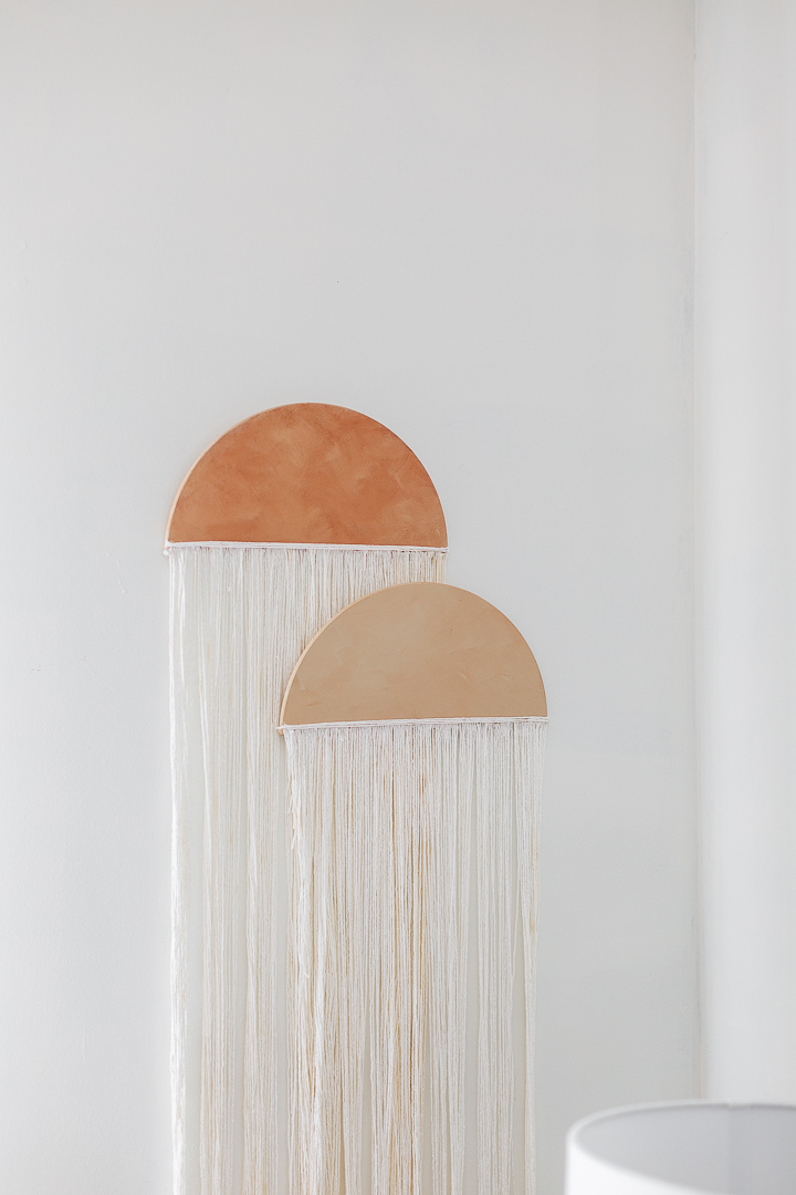 Today I have a fun and somewhat unusual piece of art to share with you. This round ‘suede’ fiber art wall hanging is modern and bohemian at the same time. I was inspired by THESE , I found at the Home Depot website for ….*puts glasses on: $447 ????