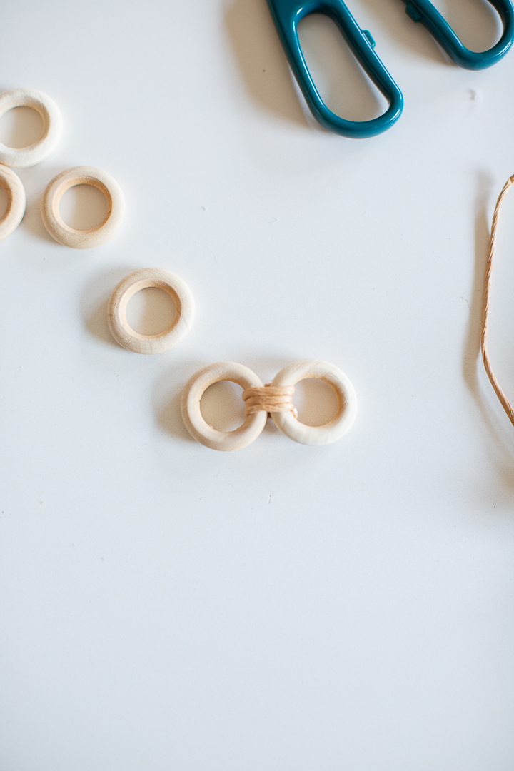 Continue to attach the rings together in a row using the raffia and hot glue.