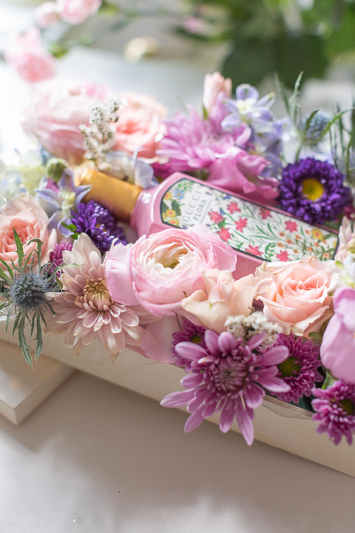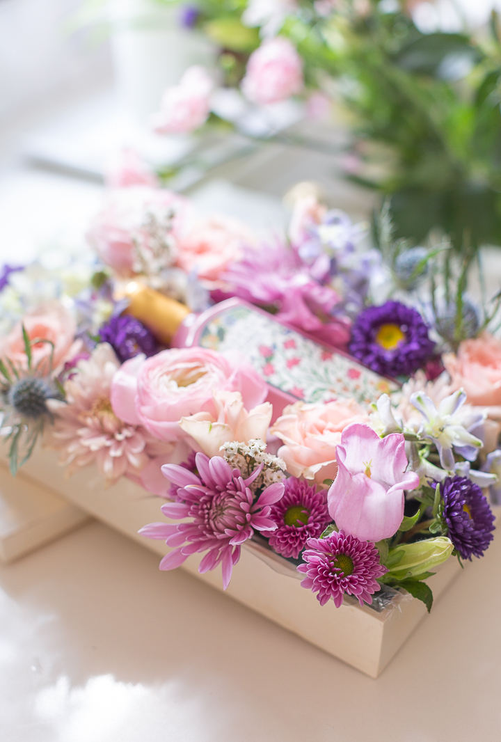 Creating a flower box arrangement with a gift in the middle is a stunning Love Pawsona way to combine floral beauty with a thoughtful present.