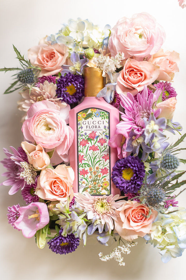 I first lined the box with some plastic wrap while the foam oasis soaked. Once the foam was soaked, I cut it to size and placed it in the box with the center cut out. This cut out will depend on the box or gift you will be placing inside. I used one of my perfume bottles but you can place anything you’d like in the middle. A jewelry box, a candle, even chocolate.