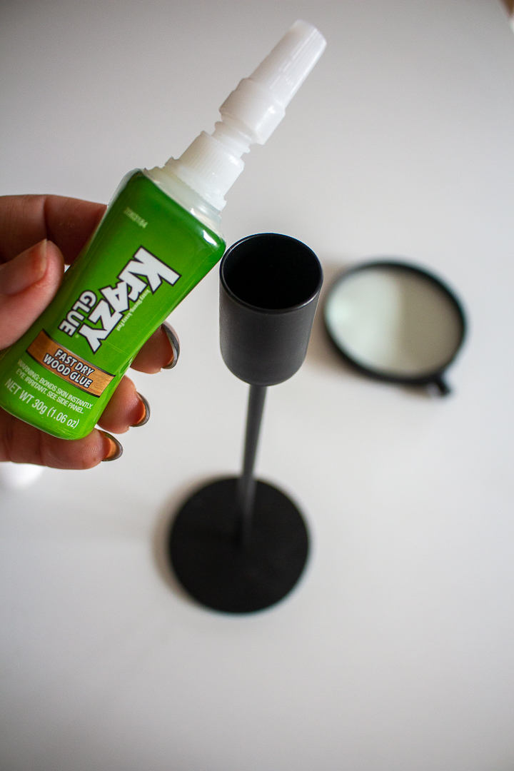 I then filled the candlestick with some hot glue, inserted the magnifying glass and added some more crazy glue in order to secure it further.