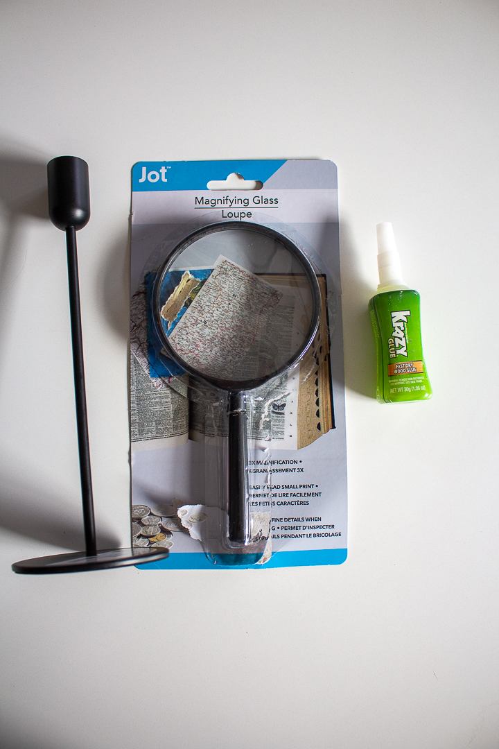 I used a magnifying glass, a candle holder, some hot glue and crazy glue.