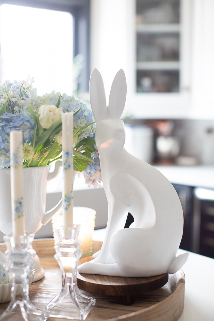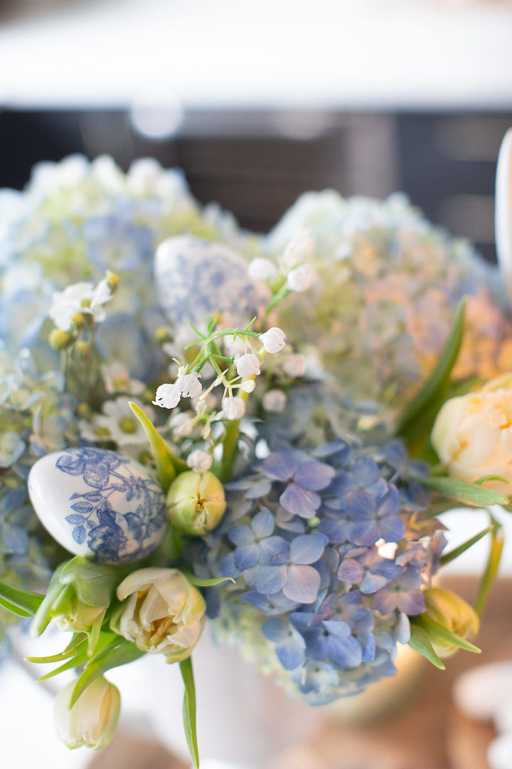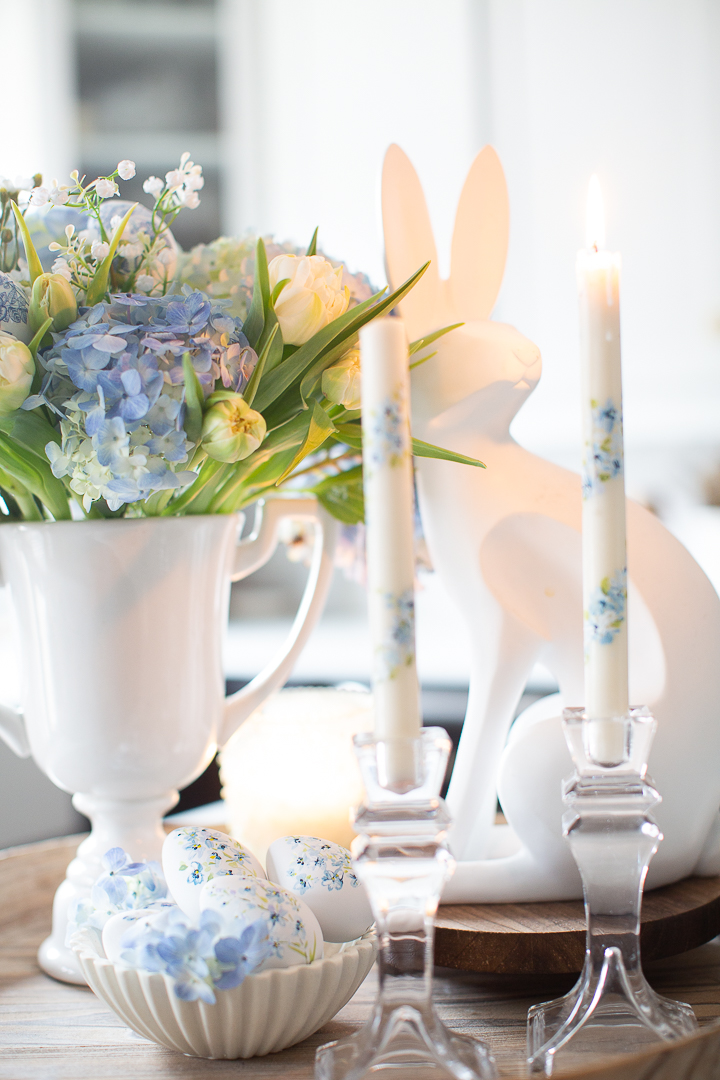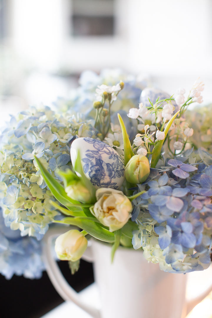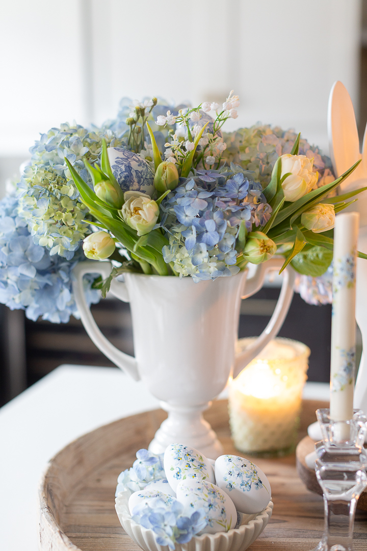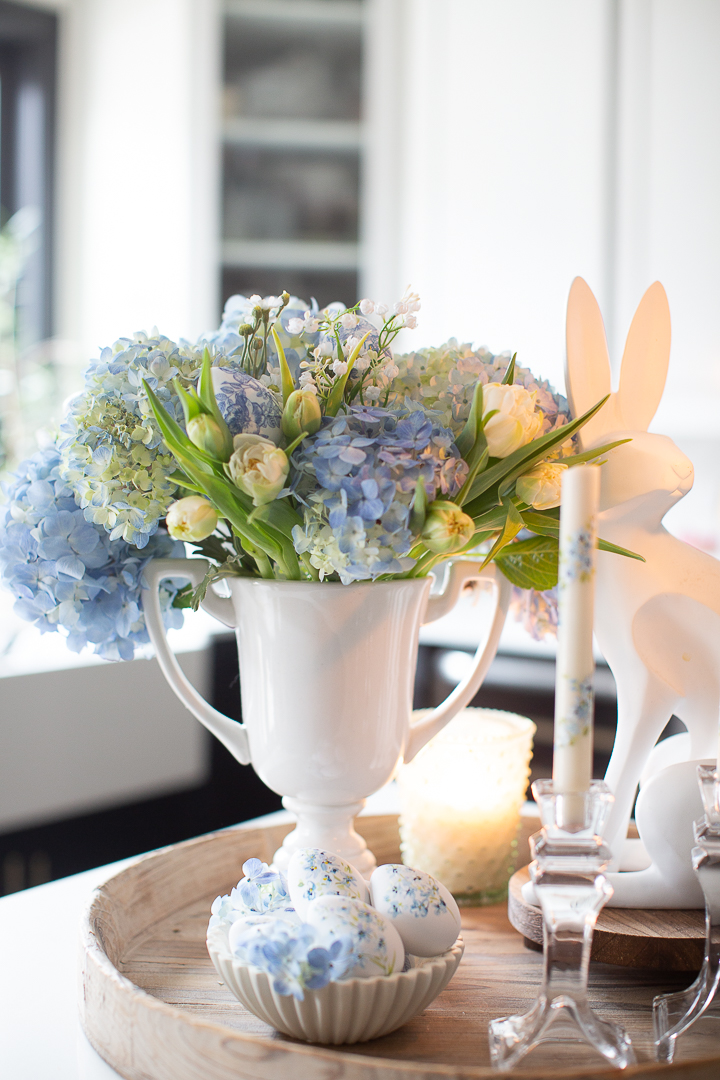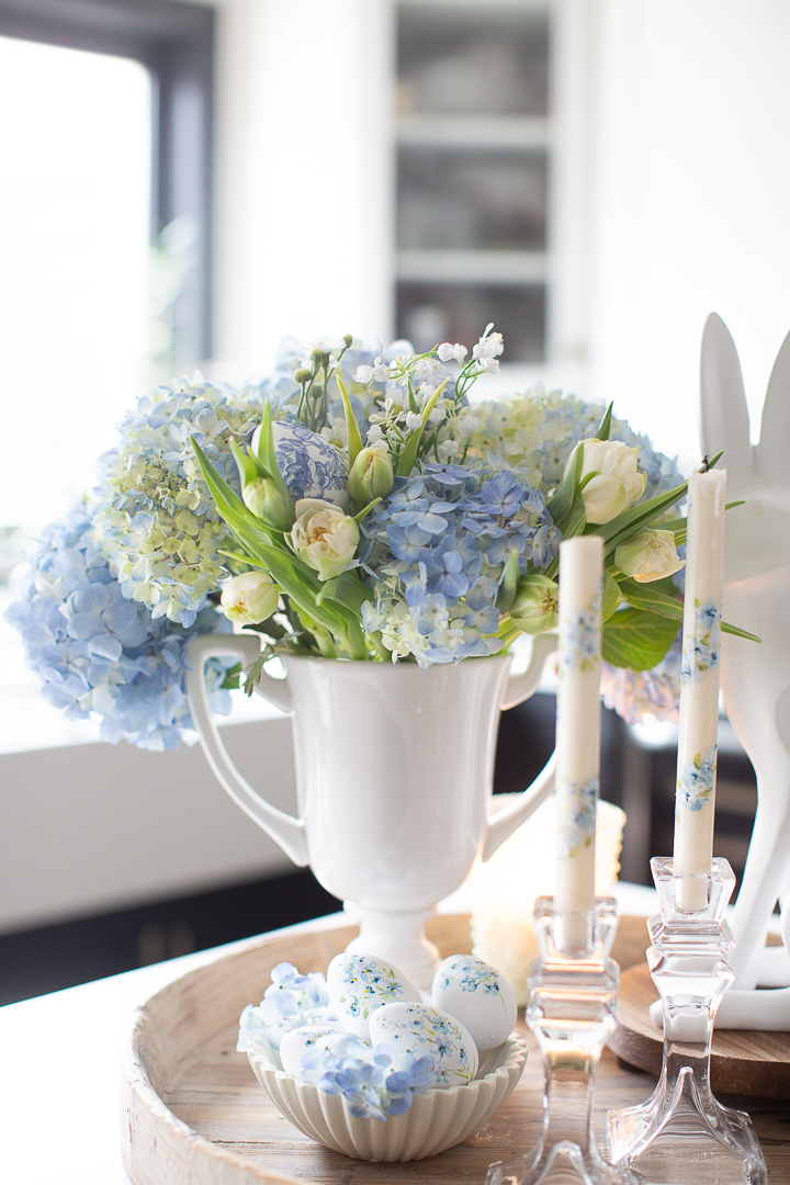 Hello friends. How have you been? It’s already April and Easter is this weekend. I love this time of year when everything starts to come to life again. I put together this pretty blue hydrangea spring/Easter vignette.