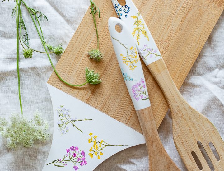 Hello friends. How are you doing? I can’t believe it’s already August!!! Where is summer going? It’s been hot,hot,hot but I’m no complaining. I don’t want summer to end. The fields are full of Queen Anne’s Lace and they are so beautiful. But today I wanted to share this pretty little Handpainted Floral Anthropologie Inspired Cutting Board. I decided to also paint the pitcher…