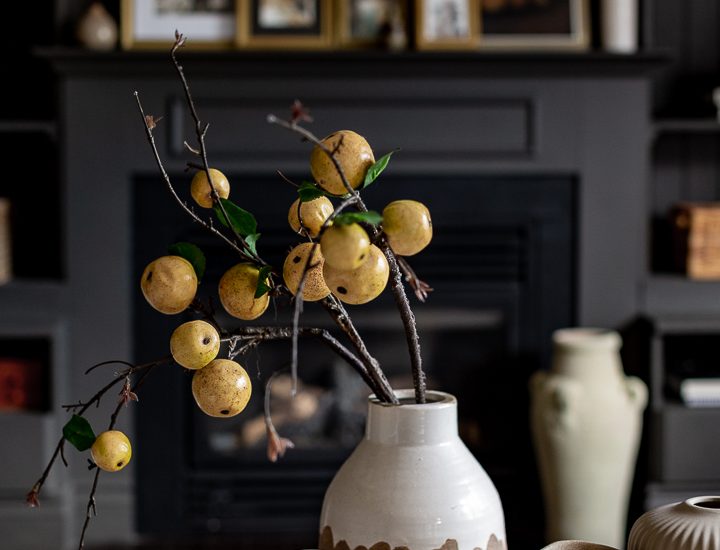 Hello friends. How have you been? I hope all is well. As the weather slowly changes, I have been adding little touches of fall in the living room. I found these beautiful ‘pears’ even though they look like apples on Amazon. It comes in a set of three branches and I just love how they look. You can add them…