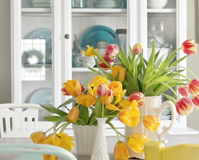 Last week, hubby surprised me with three beautifulbouquets of tulips. Aren’t they so pretty? Tulips are pretty much synonymous with Spring but as I type this, the snow outside keeps falling. To be fair, Spring doesn’t officially arrive until March 20th,but refreshing the hutch for Spring was exactlywhat I needed to cheer me up from the winter blues. Funny that I say ‘I…