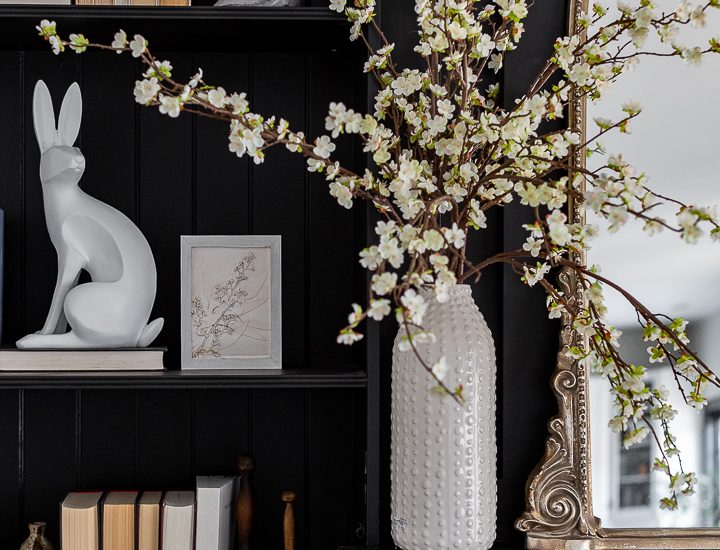 Hello friends. Happy new week. It felt like Spring on Sunday but unfortunately, it’s currently snowing again. Winters in Canada I guess. In any case, I picked THESE pretty cherry blossoms from Michaels the other day. This year, I decided to just display a very simple spring mantel. I’m kinda limited on space with the large mirror but I do…