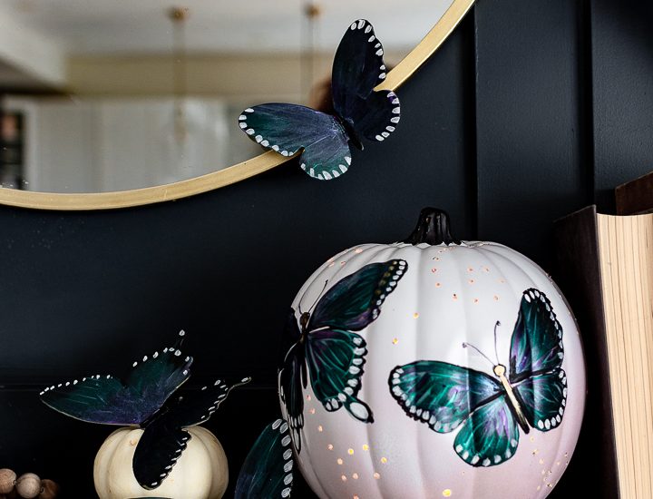 Hello friends, I hope you had a nice week. I wanted to quickly drop by today and share with you this adorable painted butterfly pumpkin luminary. I’m not really into Halloween but I think this one is so cute. Mysterious enough but not spooky…:) I love how it turned out and how pretty it looks at night with the little…