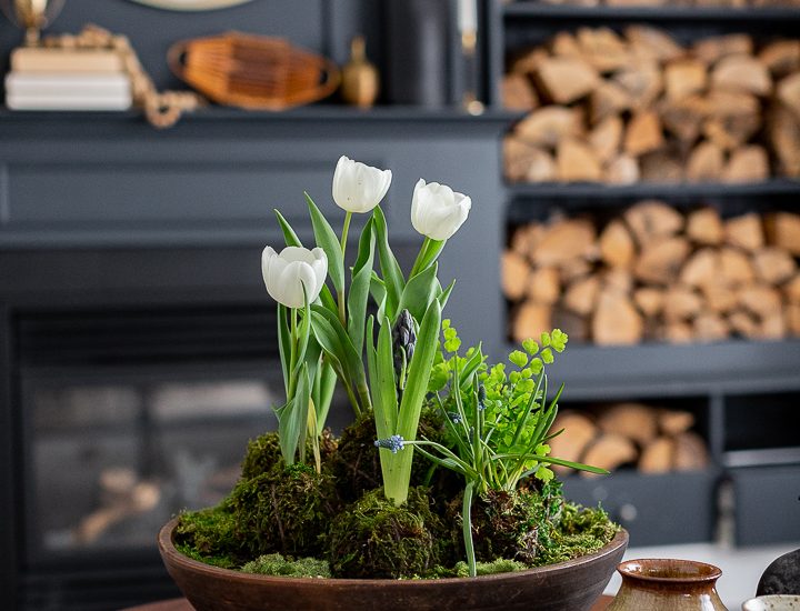 Hello friends. I hope your week is going great so far. I have a super cute spring idea for you today which I’m excited to share with you. This sweet Spring bulbs Kokedama arrangement is so fun to put together and I think it’s perfect for Spring. I made these before but I wanted to make it a little more springy…