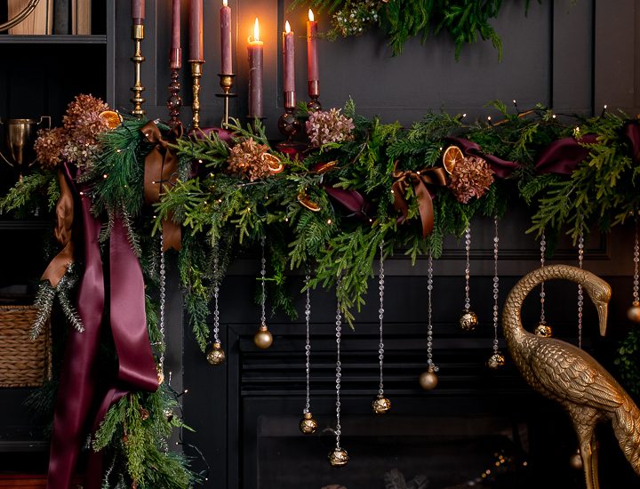 Hello friends. How are you? I’m excited to share this year’s Moody Christmas Mantel with burgundies and hints of wine. It mimics the same colors as the tree and I think it looks so elegant. I used a mixture of garlands and picks to create a lush looking garland. I included dried hydrageas, dried oranges and of course lots of…
