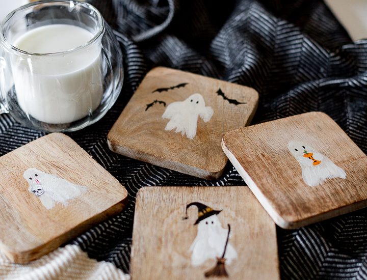Hello friends. I hope you had a nice weekend. Today I wanted to share a cute little craft inspired by THESE. I’m not much of a Halloween girl but these Painted Ghost Wooden Coasters Inspired by PB are so cute and I couldn’t help painting my own. I bought these wooden coasters from the Dollar Store but there are similar ones…